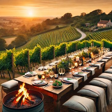 We’re fortunate to know many talented vine growers across Essex, allowing us to create unforgettable dining experiences among the region’s lush vineyards. Vine & Barrel is the perfect setting for those who appreciate fine wine and fire-cooked cuisine. Guests can savor locally produced vintages while indulging in expertly grilled meats and artisanal dishes, all set against the stunning backdrop of rolling vines. Whether you’re planning an intimate dinner or a grand celebration, this setting blends the romance of the vineyard with the warmth and spectacle of open-fire cooking.